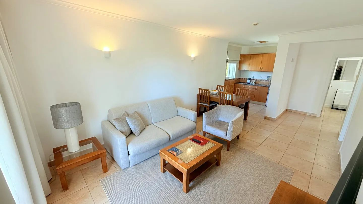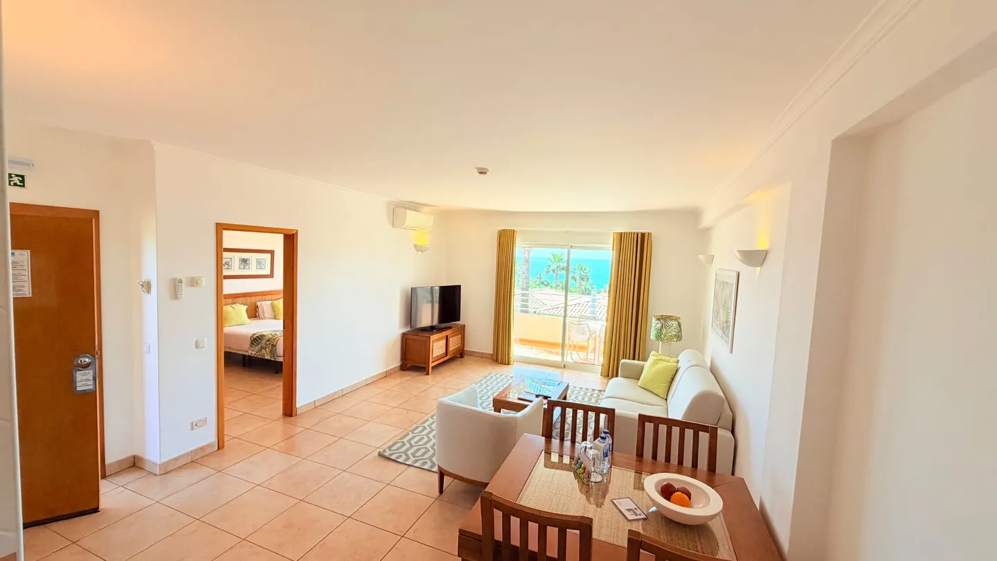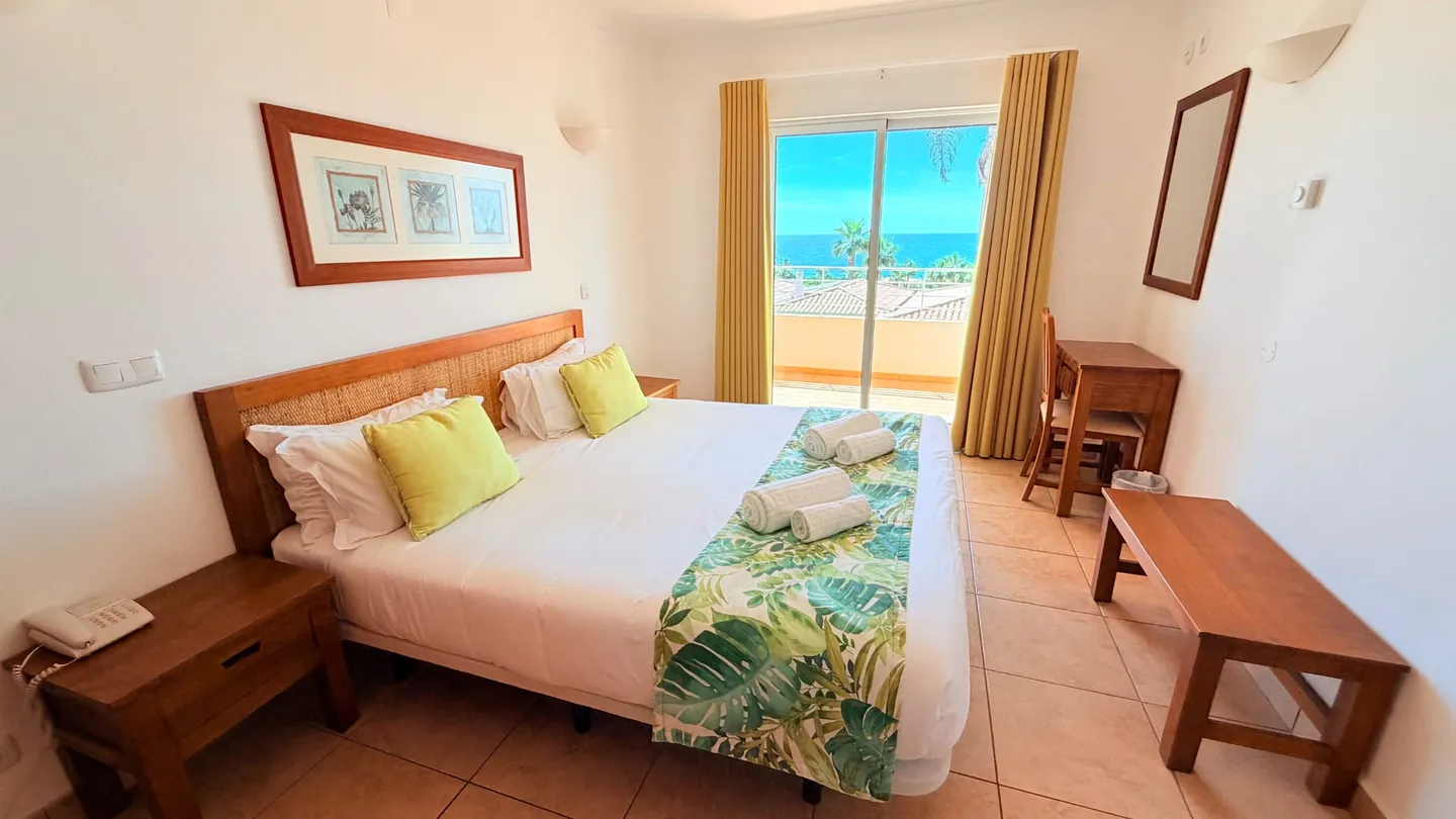 Dieses geräumige Apartment bietet einen fantastischen Meerblick. Es verfügt über 1 Schlafzimmer mit 2 Einzelbetten und einen Wohnbereich mit Klimaanlage. ein Schlafsofa für 1 Person, ein Fernseher Satellit und ein Esstisch.