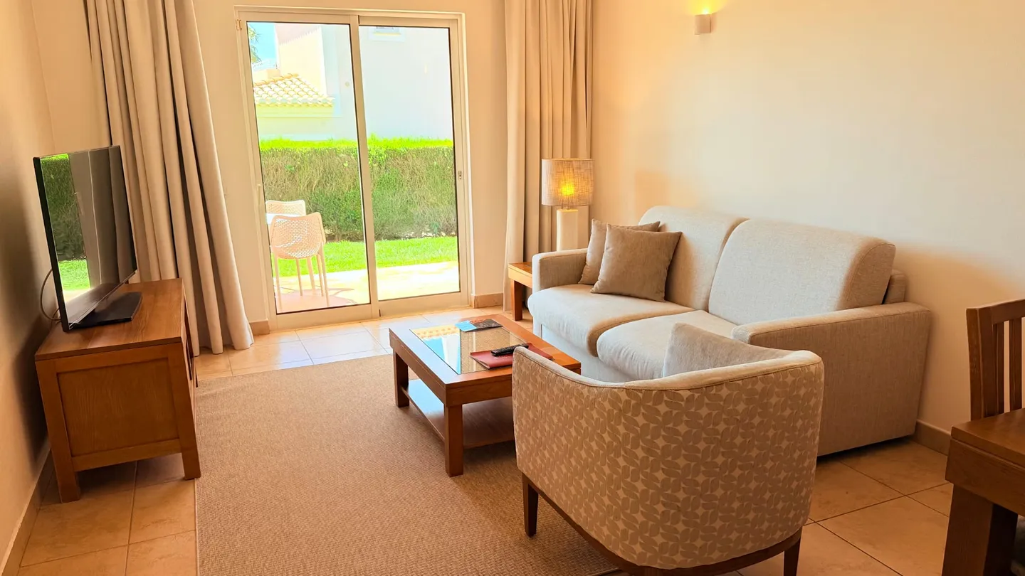 Diese geräumige Wohnung im Erdgeschoss mit Terrasse bietet Blick auf den Garten. Es verfügt über 1 Schlafzimmer mit 2 Einzelbetten und einen Wohnbereich mit Klimaanlage, ein Schlafsofa für 2 Personen, ein Fernseher Satellit und ein Esstisch.